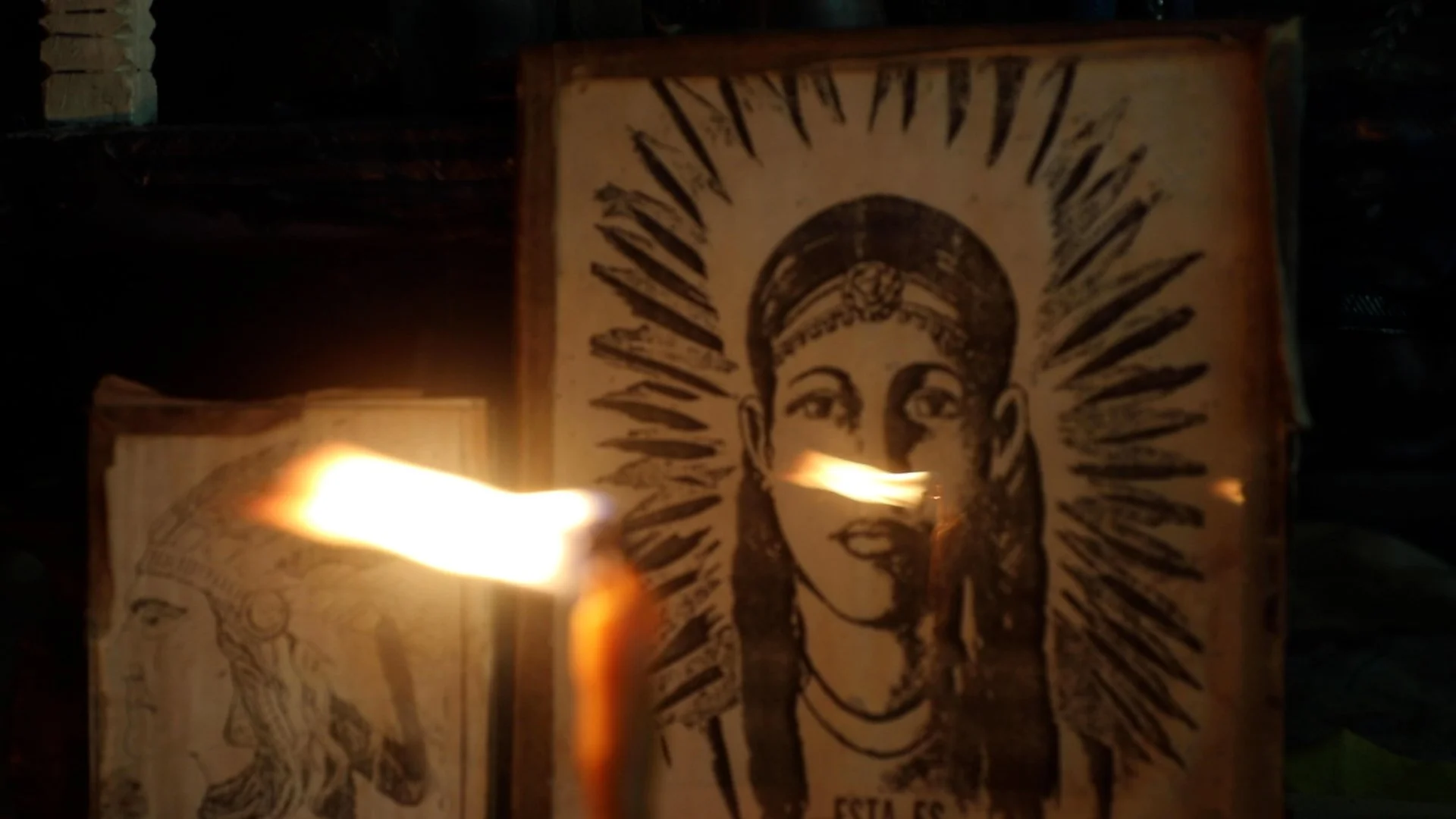 Carmen nos lleva al corazón del calvario, su altar. Bajo un techo adornado con festones de papel recortado, los vibrantes colores azul, amarillo y rojo llenan el espacio. Velas encendidas proyectan su luz sobre imágenes cuidadosamente dispuestas de santos, reflejando una fusión de espiritualidades católicas, taínas y africanas. Vemos tres tambores azules, o palos, reposan como guardianes del ritmo sagrado, mientras una gran imagen de Liborio Mateo preside la sala, su mirada penetrante testigo de la devoción que lo mantiene vivo.