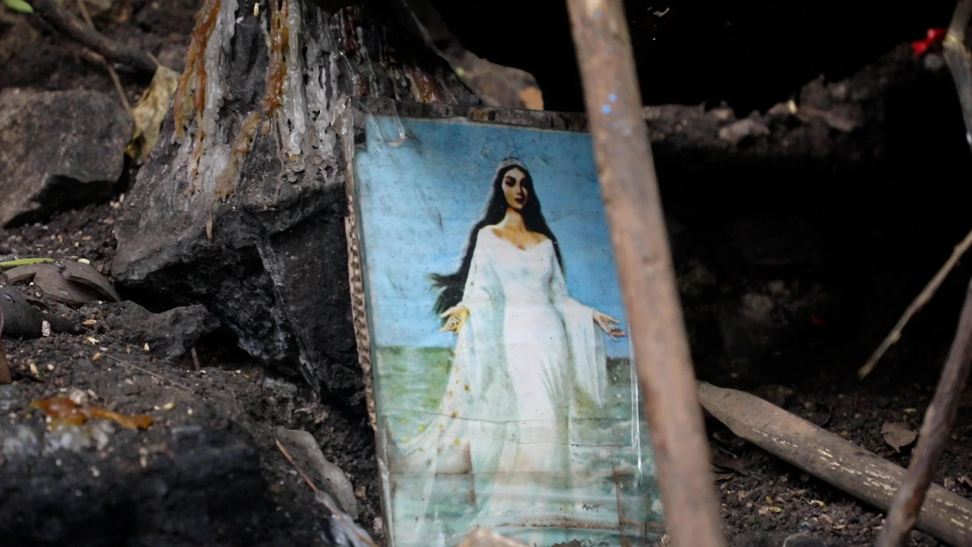 A los pies de la ceiba reposa un altar, envejecido pero vivo, que recuerda al de la casa de Carmen. Allí descansan imágenes de santos, ofrendas y símbolos sagrados. En el centro, firme e inamovible, está la imagen de Papá Liborio; vigilante, eterno, corazón palpitante de este lugar sagrado.